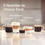 - 5 CAFÉS AROMÁTICOS: Disfruta de tus cafés favoritos para momentos especiales. Ya sea que desee un café expreso, café, americano, capuchino o un café con leche, su máquina de café espresso totalmente automática ofrece un resultado perfecto en la taza sin complicaciones y en poco tiempo.